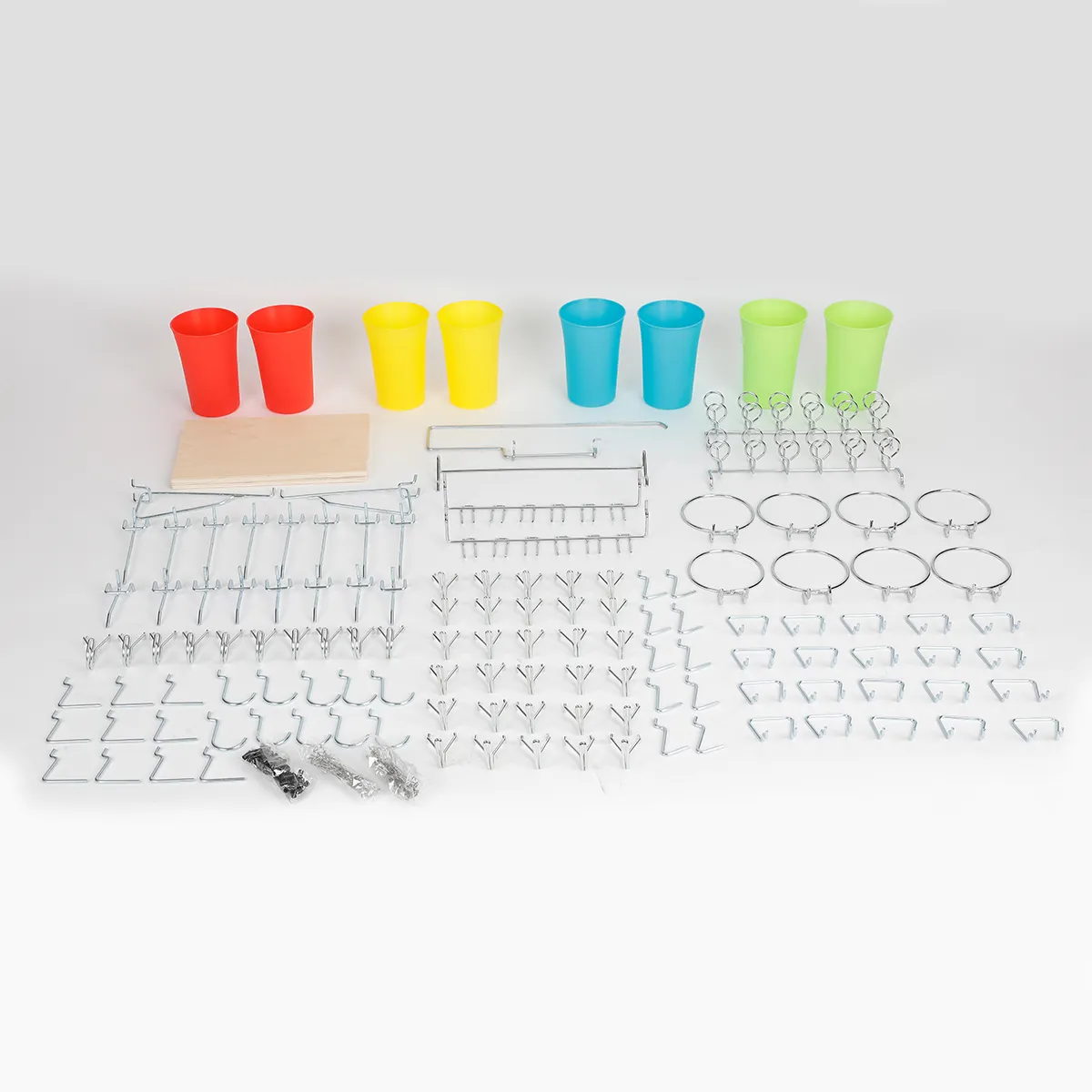 Contains 173 pieces: 1PC Wood Board, 2PC Stopper Nails, 1PC Paper Towel Holder, 2PC 6-ring Tool Holder, 2PC Multi-prong Tool Holder, 2PC Tray Support, 8PC 4" Straight Hooks, 8PC 2" Straight Hooks, 10PC Large Curved Hooks, 10PC L-Angled Hooks, 10PC V-Angled Hooks, 20PC Pliers Holders, 30PC 2-pronged L-Hooks, 10PC 2-pronged J-Hooks, 8PC Metal Cup Holders, 8PC 450ml Plastic Cups (2-Red, 2-Blue, 2-Yellow, 2-Green), 40PC Stainless Steel Peg Locks.