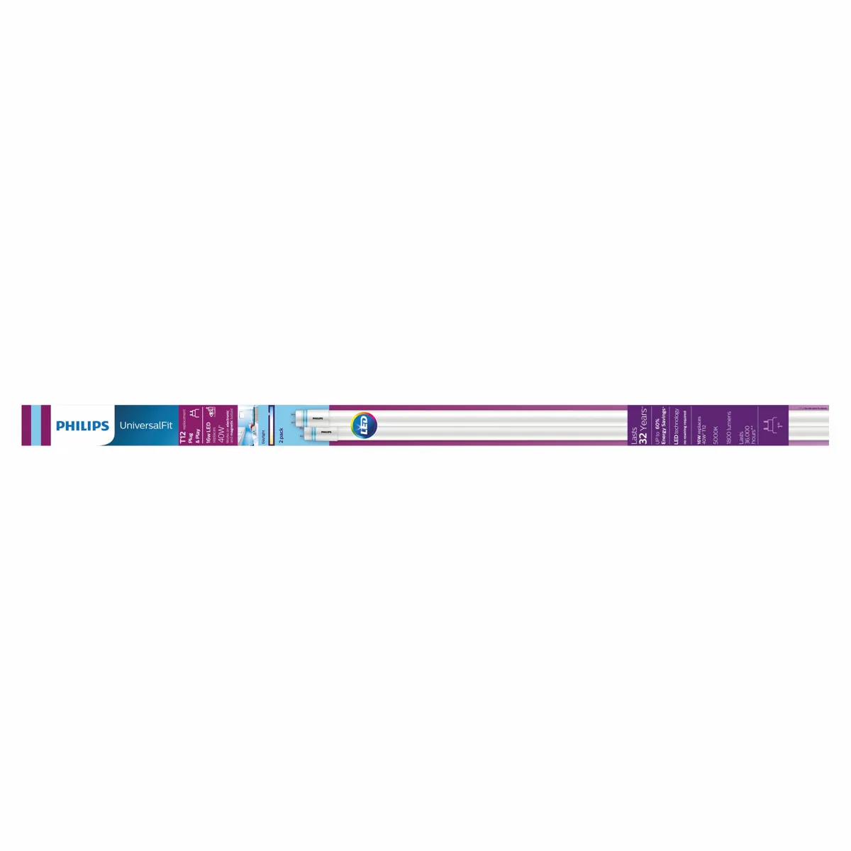 Philips Universal Fit LED tubes easily replace fluorescent T12 tubes operated on rapid-start magnetic ballasts; no rewiring needed. This glass LED linear bulb looks and feels like fluorescent and has a cool white light and long lifetime.