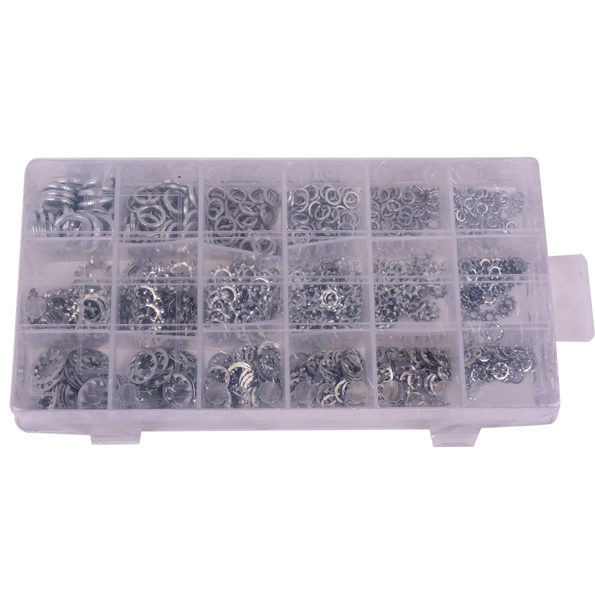 • Contains 720 Pieces: FLAT: (50) - #6; (50) - #8; (50) - #10; (30) - 5/16in; (20) - 3/8in; (40) - 1/4in); EXTERNAL LOCK: (50) - #6; (50) - #8; (50) - #10; (30) - 5/16in; (20) - 3/8in; (40) - 1/4in); INTERNAL LOCK: (50) - #6; (50) - #8; (50) - #10; (30) - 5/16in; (20) - 3/8in; (40) - 1/4in.