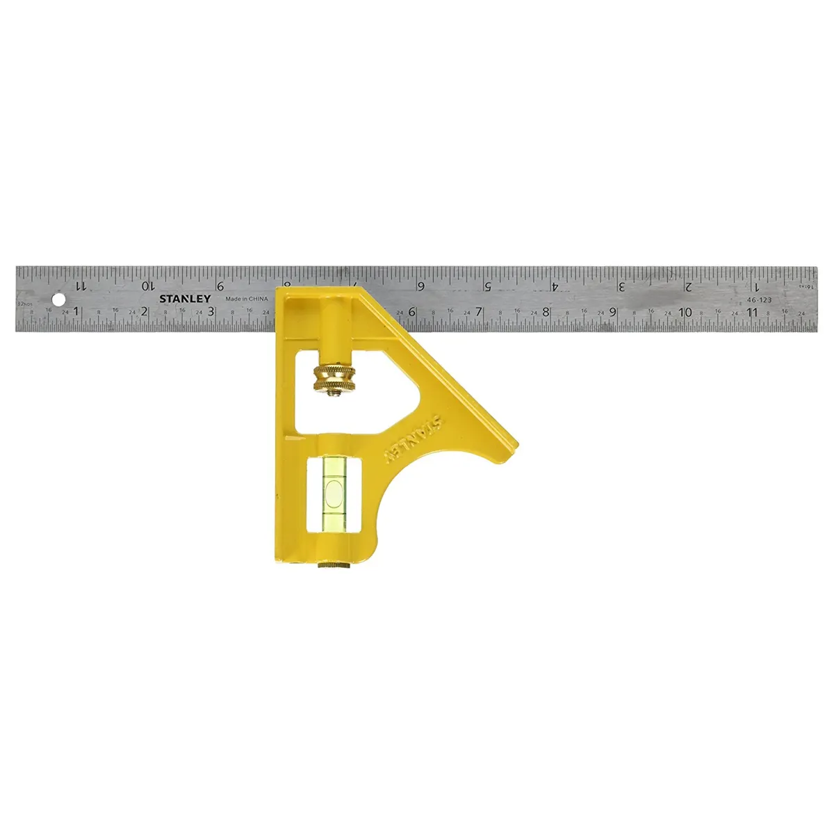 Contractor grade combination square with a square for English measurements; a level vial; and a scratch awl. Durably etched; hard-chrome-plated blades are rust resistant and made to last. 12 in square has precision-machined working surfaces for improved accuracy. Builtin scriber comes in handy for surface marking. Easy-to-read vial. High-visibility yellow; die-cast handle with brass hardware for durability.