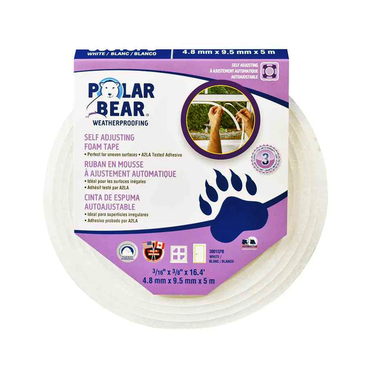 The Polar Bear white self adjusting foam tape is 16.4 ft. long. It is ideal for indoor applications and gives the best compression for small gaps. This foam tape is made of polyurethane.