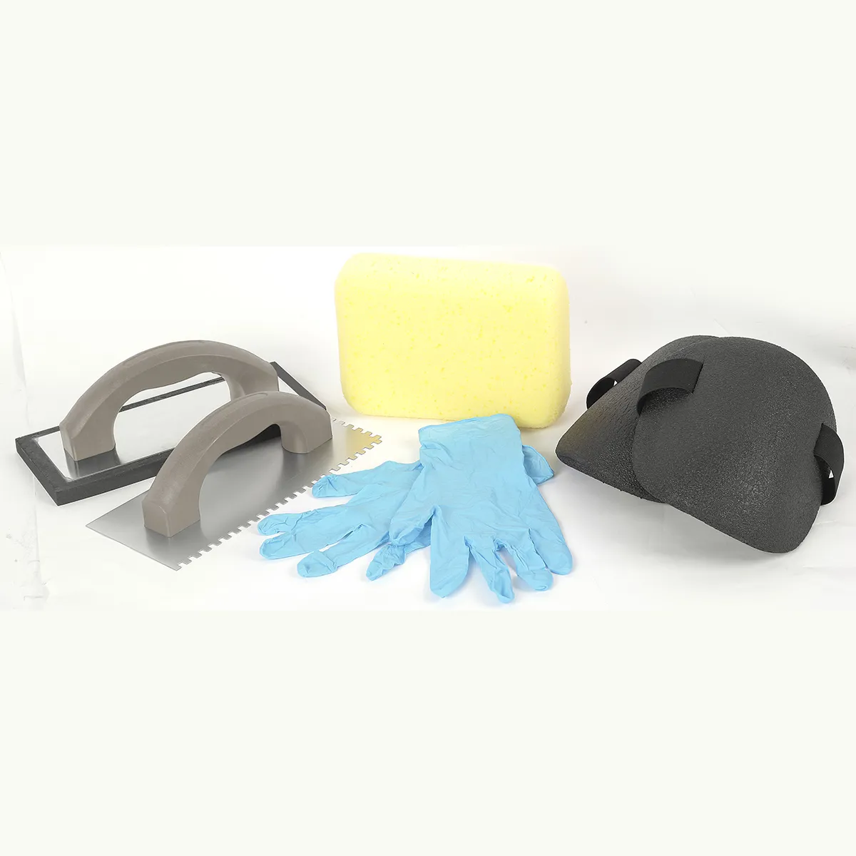 - Kit contains: a pair of gloves, knee pads, grout sponge, notched trowel and grout float.