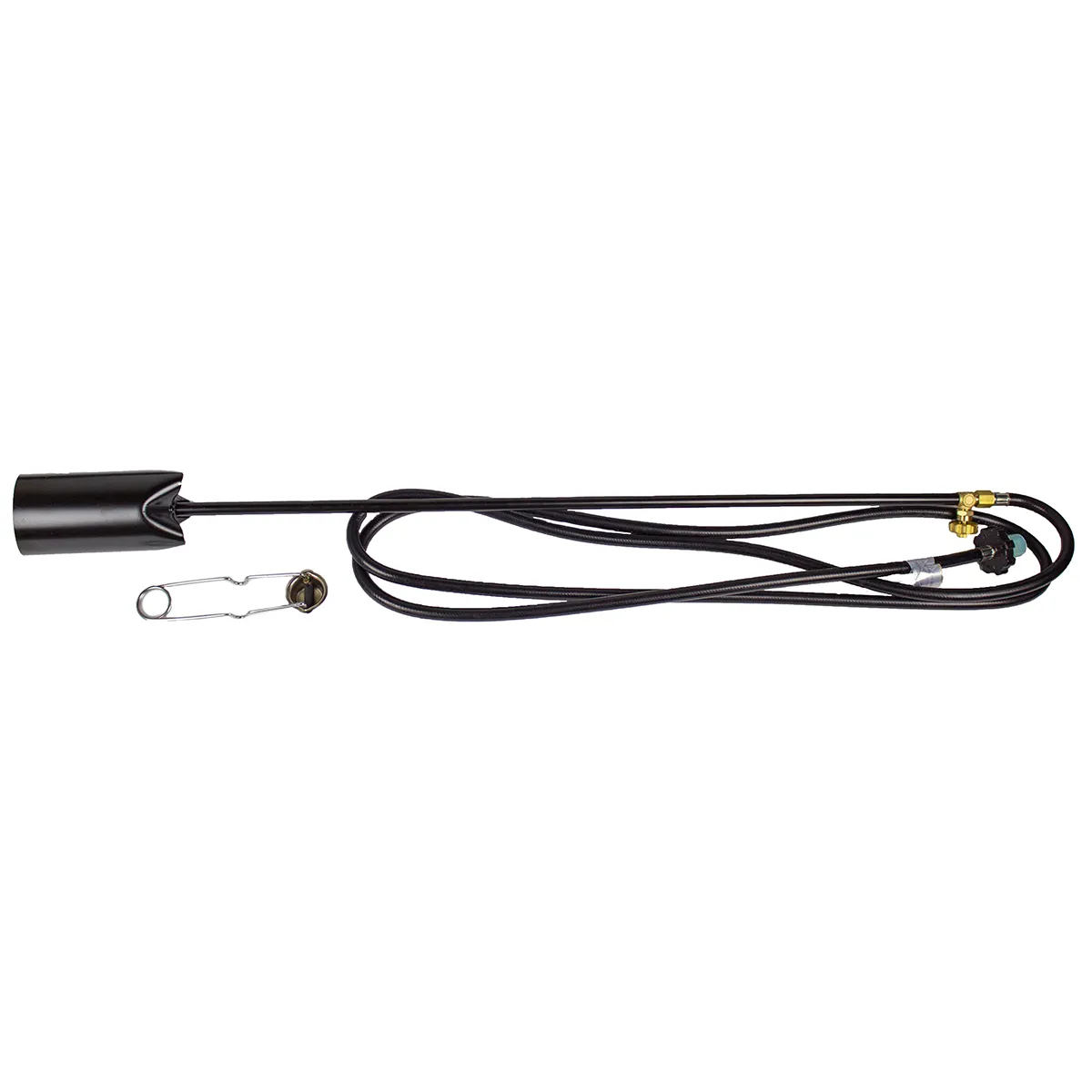 Torch made of steel with brass control valve and a rubber grip for comfort.