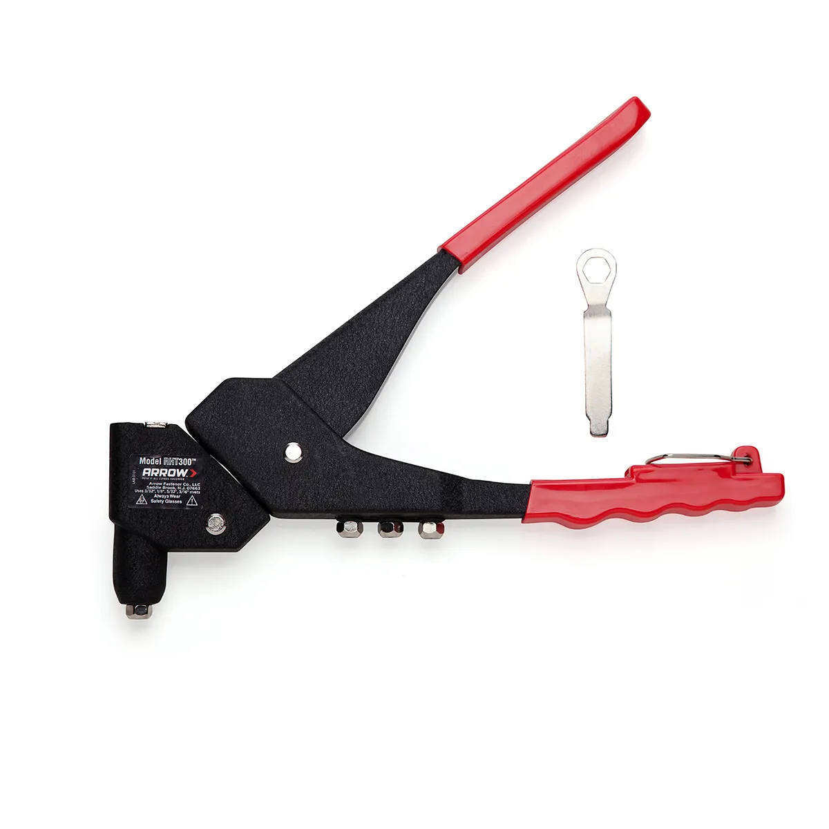 The Arrow swivel head rivet tool is a true professional rivet tool with a full 360 deg swivel head and extended nose design that makes riveting in difficult corners; angles; and tight spaces fast and easy. The tool features rugged all steel construction; spring loaded handles for easy loading; soft vinyl hand grips; 4 different size nose pieces; nose changing wrench; and convenient handle lock for easy storage.