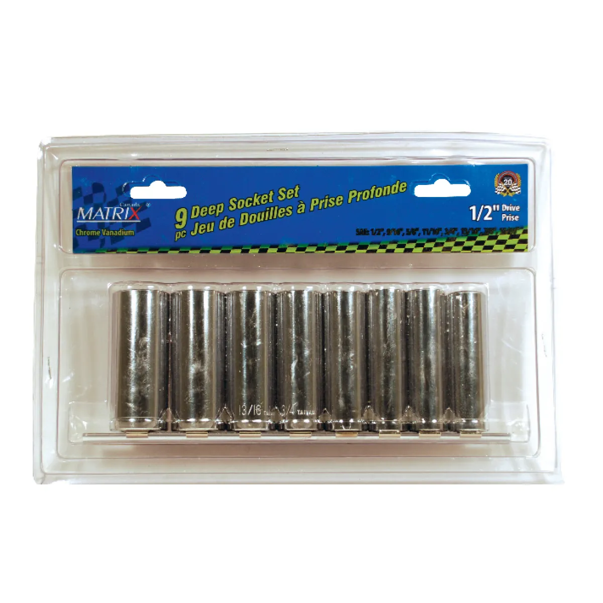 • 1/2in drive sizes: 1/2in; 9/16in; 5/8in; 11/16in; 3/4in; 13/16in; 7/8in; 15/16in.