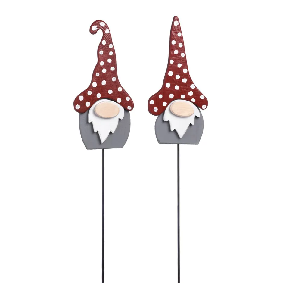 16in decorative wooden gnomes stake in assorted sizes.